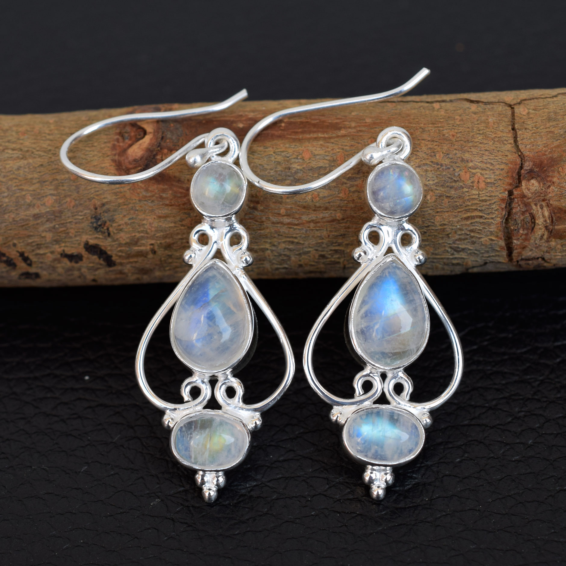 Natural Rainbow moonstone Earring 925 Sterling Silver Handmade-SE35