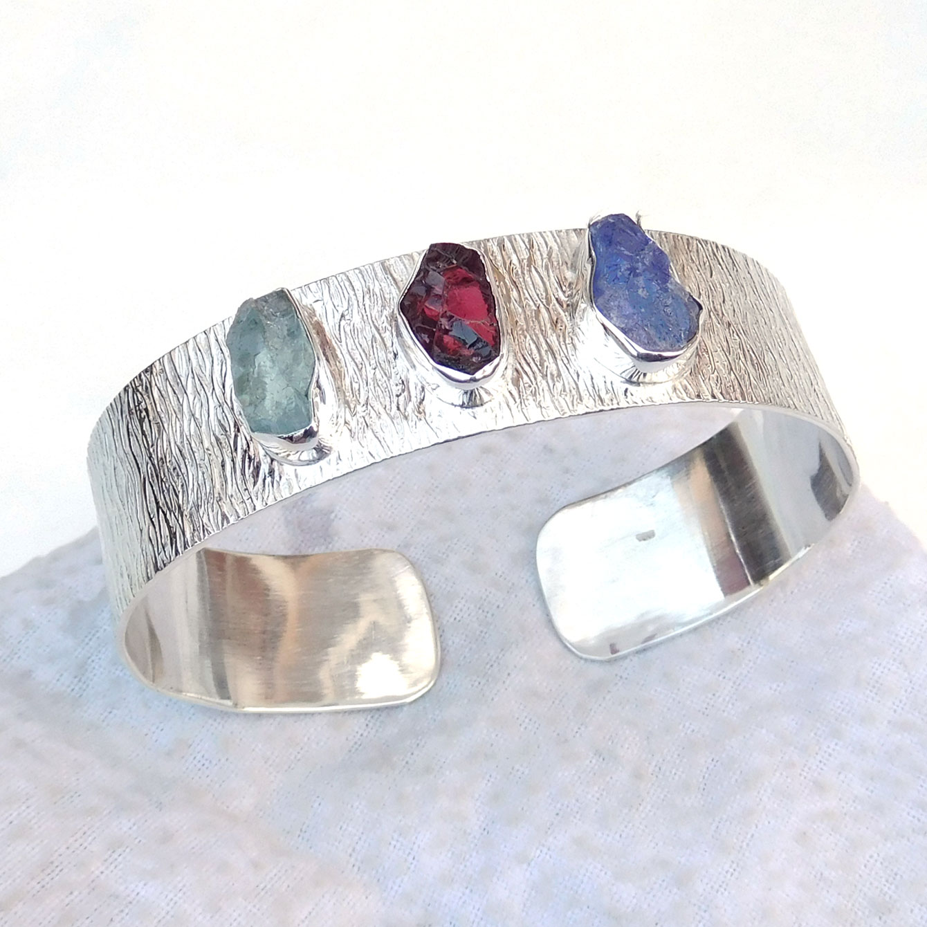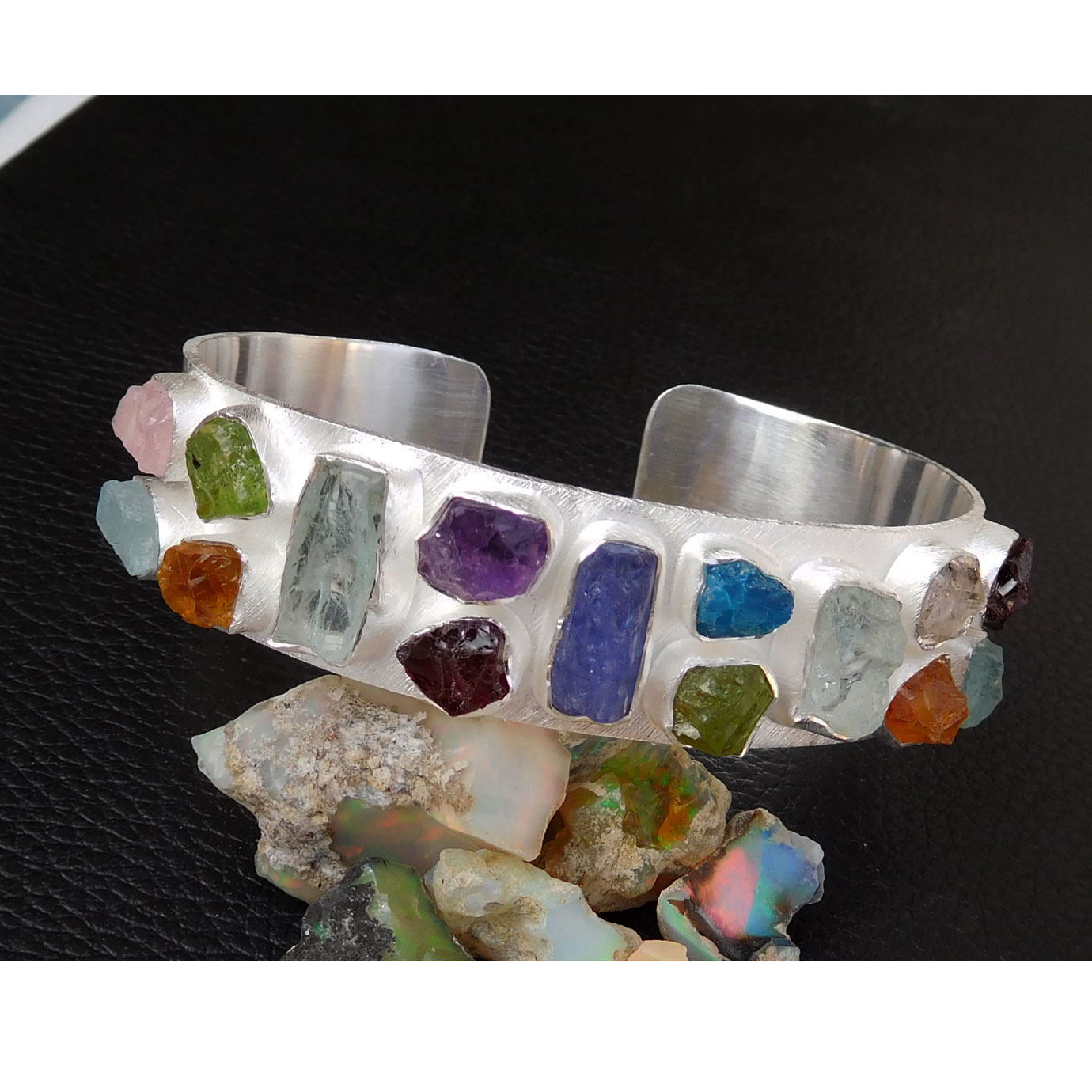 Cuff Bracelet Natural Multi Raw gemstone Bracelet 925 Sterling Silver Matte-BN05
