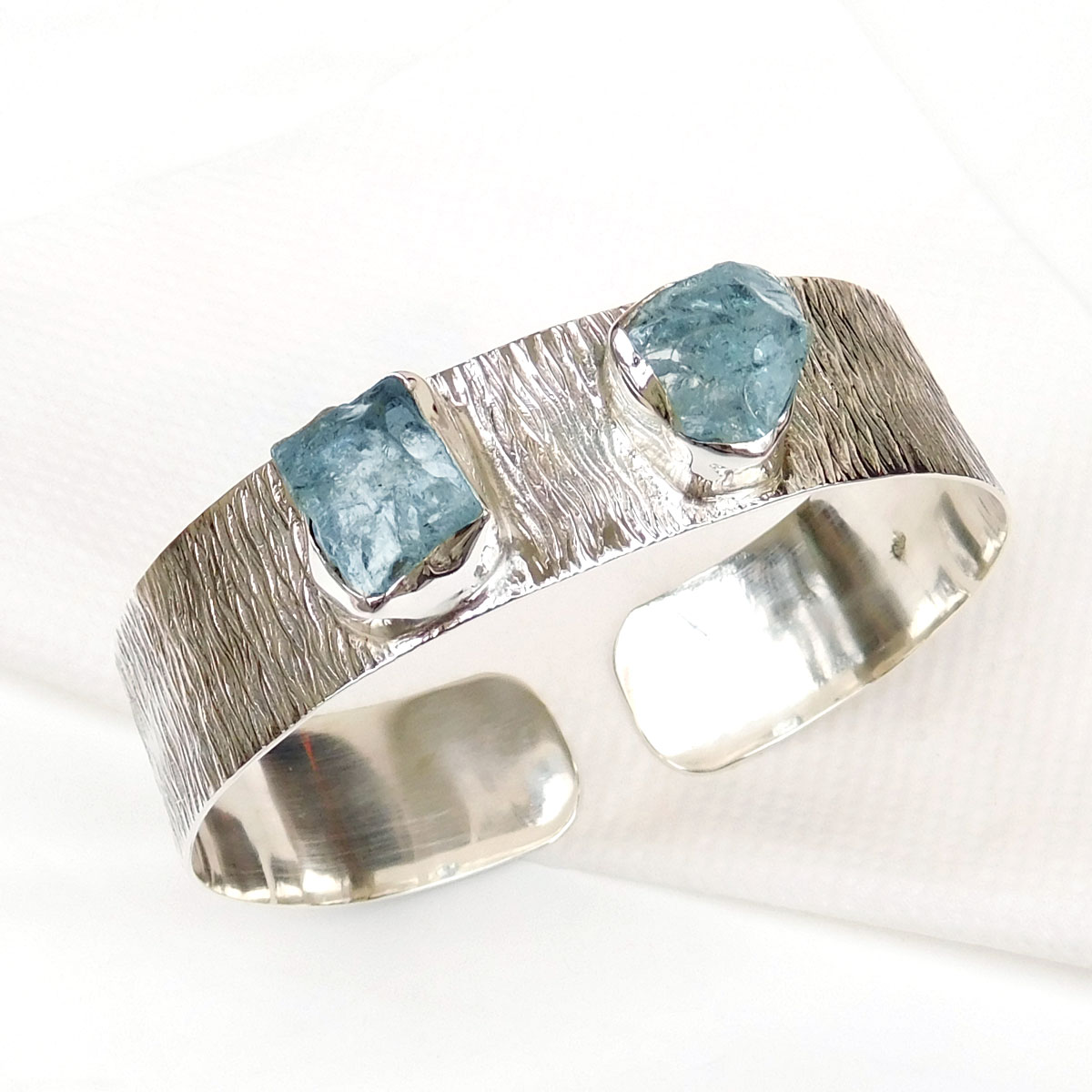 Raw Aquamarine Blue Topaz Cuff Bracelet 925 Sterling Silver Handmade-BN016