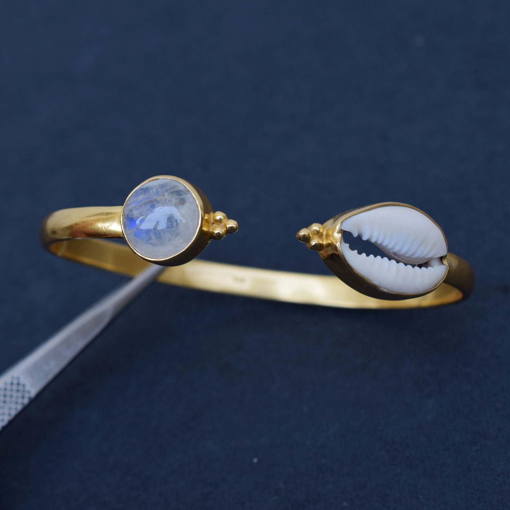 Natural Moonstone & Cowrie Gemstone Bangle Bracelets Adjustable-BN010
