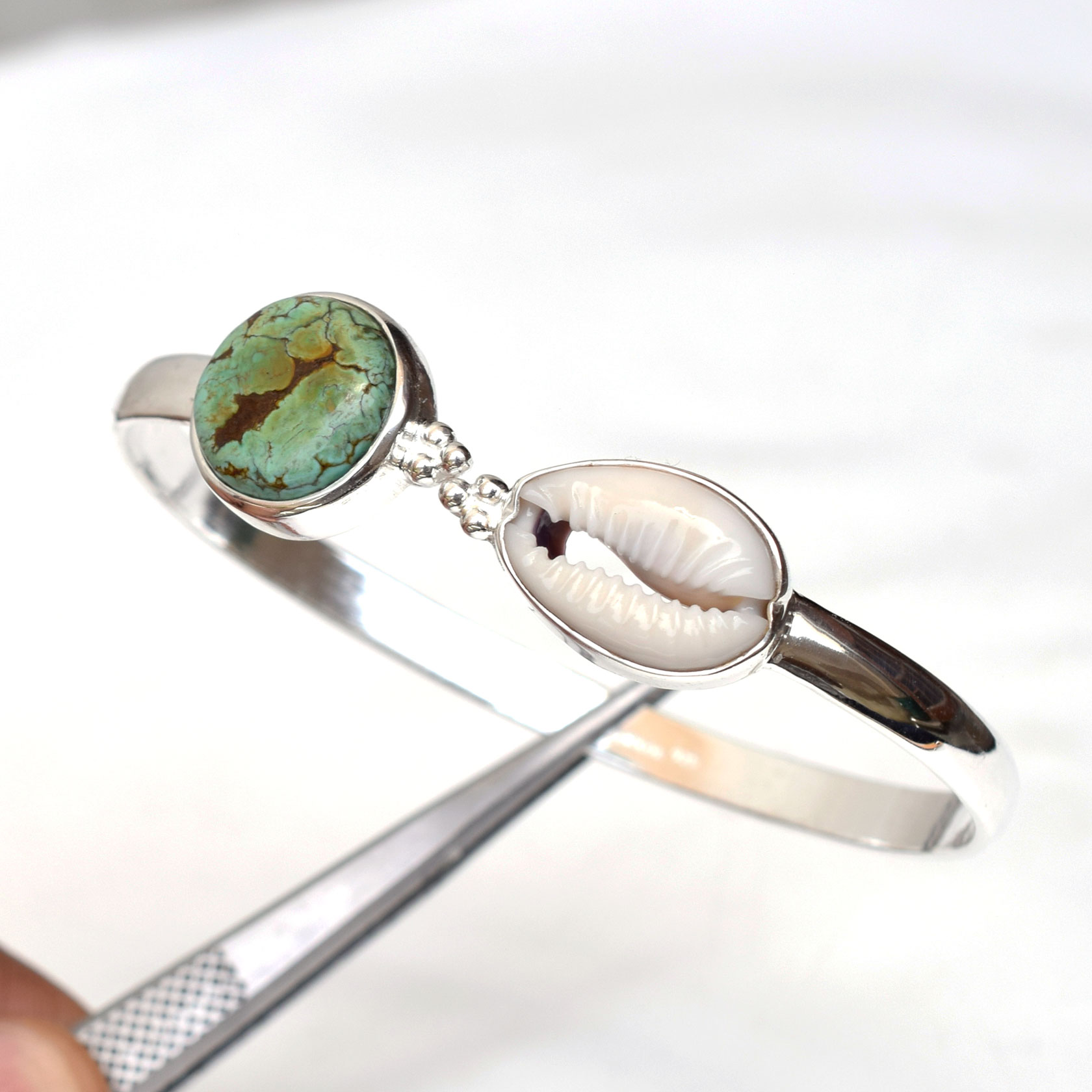 Natural Tibet Turquoise & Cowrie gemstone Bangle 925 Sterling Silver-BN012