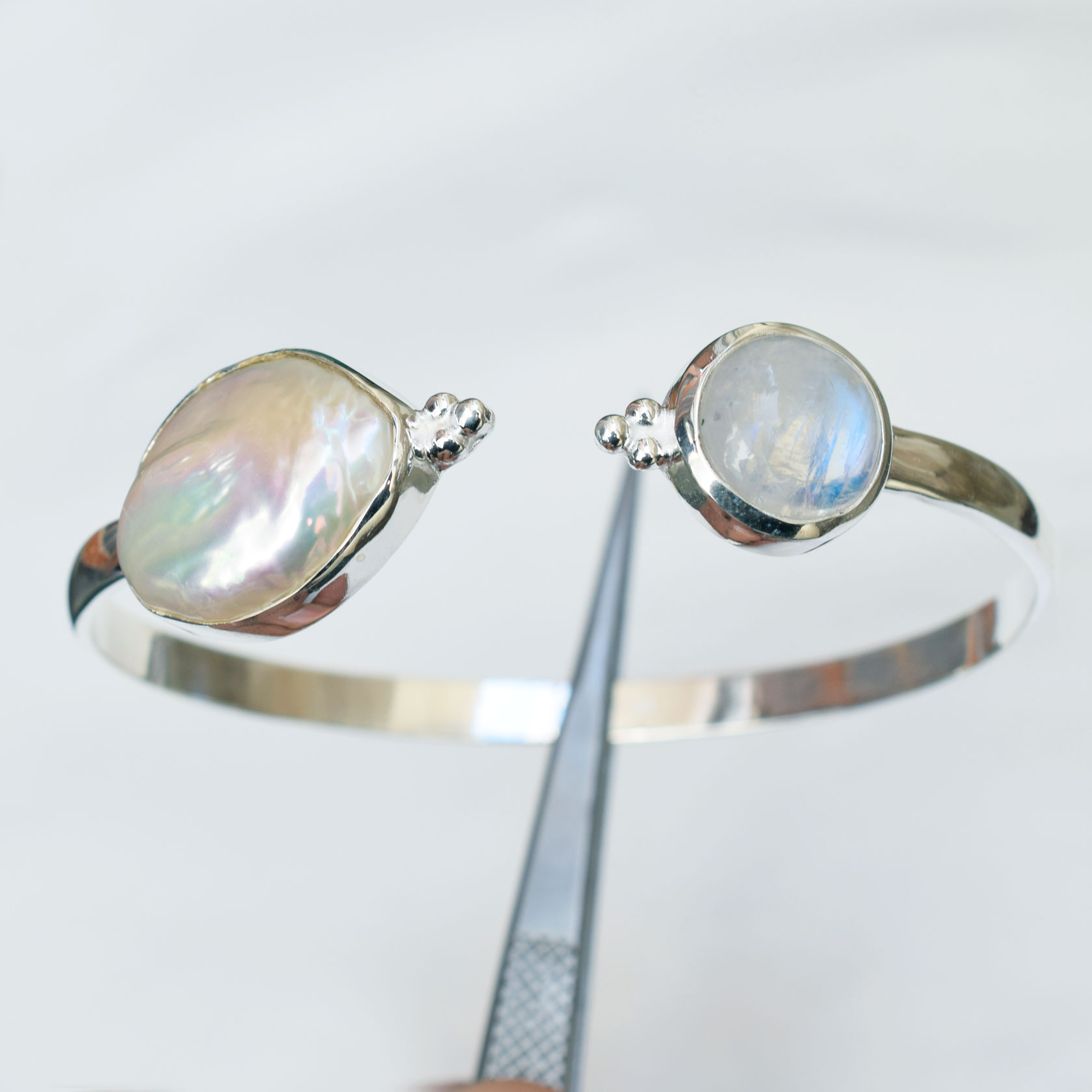 Natural Moonstone & Pearl Bangle 925 Sterling Silver Adjustable Braclet-BN013