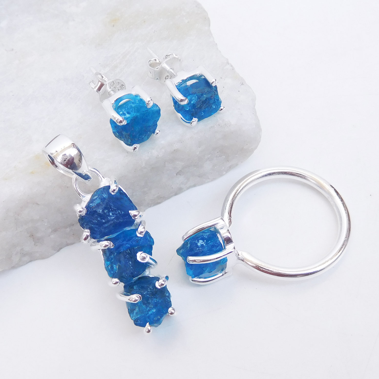 Neon Blue Apatite Jewelry Sterling Silver Set Natural Raw Apatite Jewelry-SET11