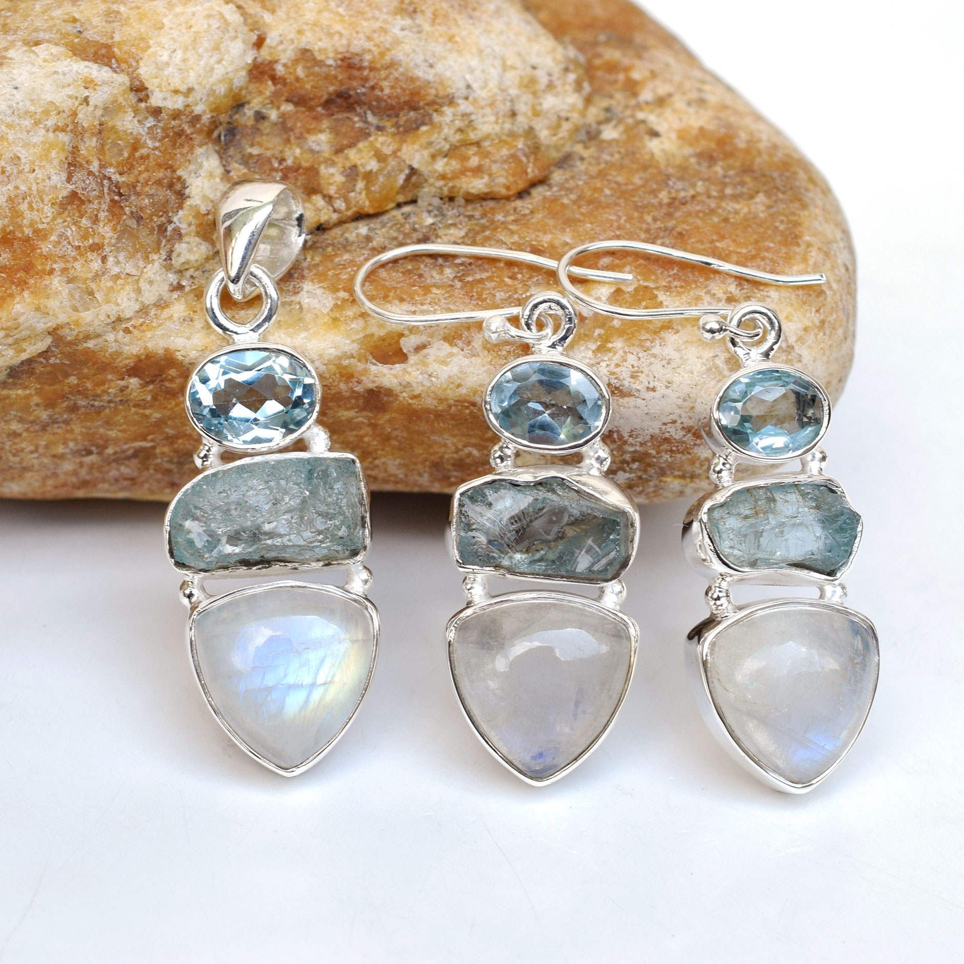 Natural Moonstone & Aquamarine Jewelry Set 925 Sterling Silver Handmade-SET16