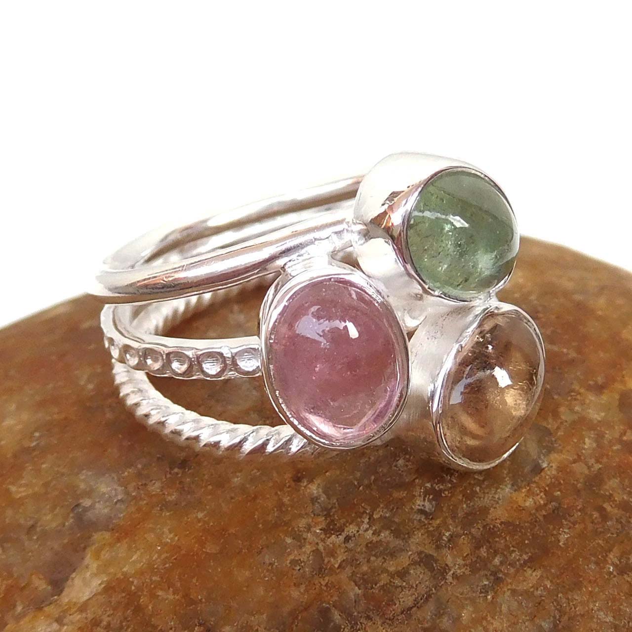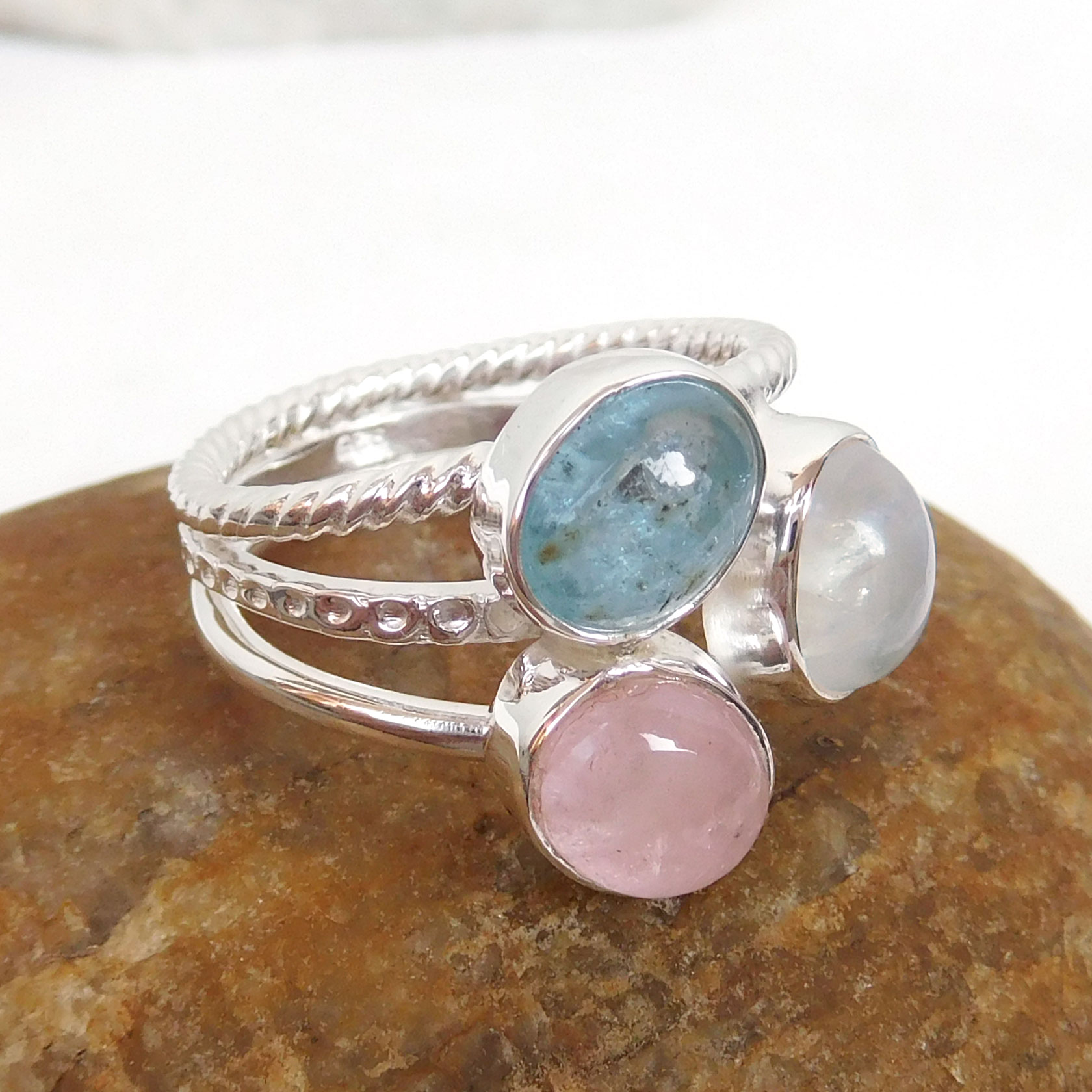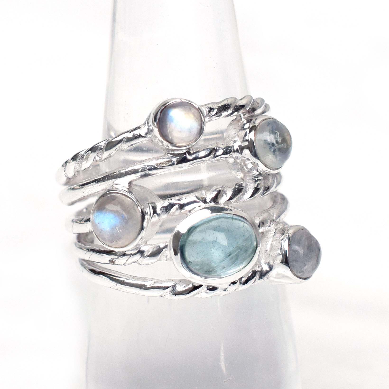 The rings use a selection of beautiful and unusual gemstones such as aquamarine, tourmaline, tanzanite, quartz, rainbow moonstone, kyanite, topaz, peridot and herkimer diamond, but also natural raw crystal healing gemstone. The glorious gems are set in 925 sterling silver and surrounded by simple silver shapes, hand cast silver pebbles and contrasting textures and finishes.