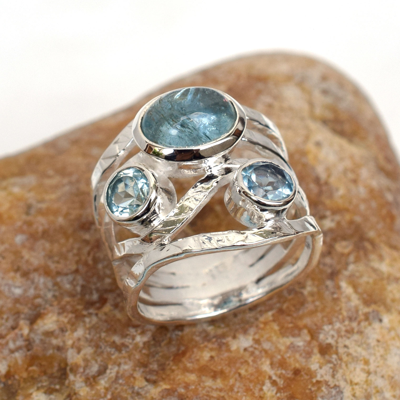 Natural Aquamarine & Blue Topaz Ring Multi stone Ring 925 Sterling Silver-SR361