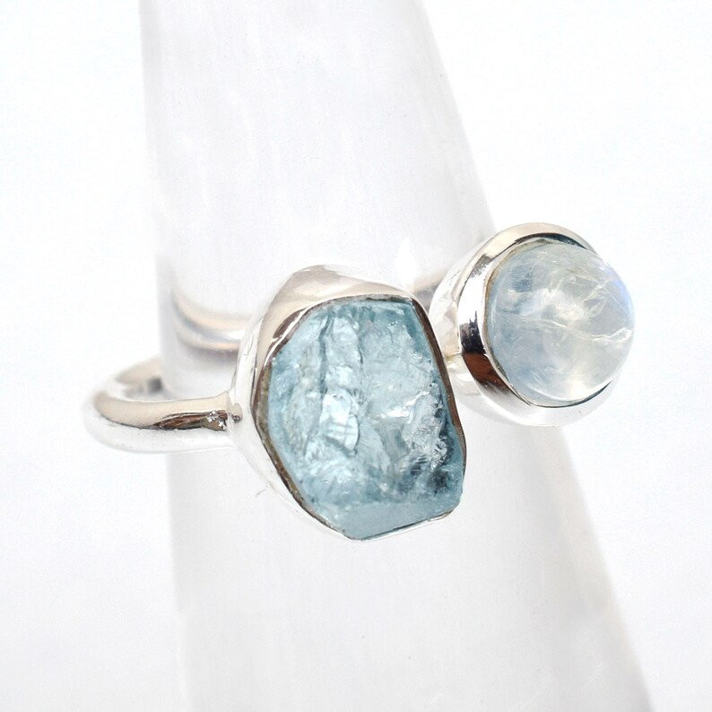Natural Raw Aquamarine & Moonstone Ring 925 Sterling Silver Adjustable-SR385