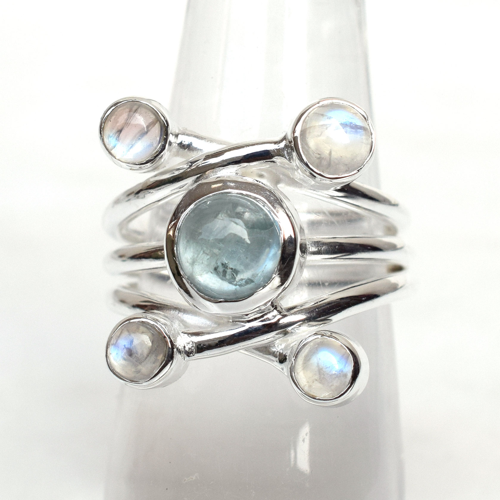 Natural Aquamarine & Moonstone Ring Multi stone Ring 925 Sterling Silver-SR427